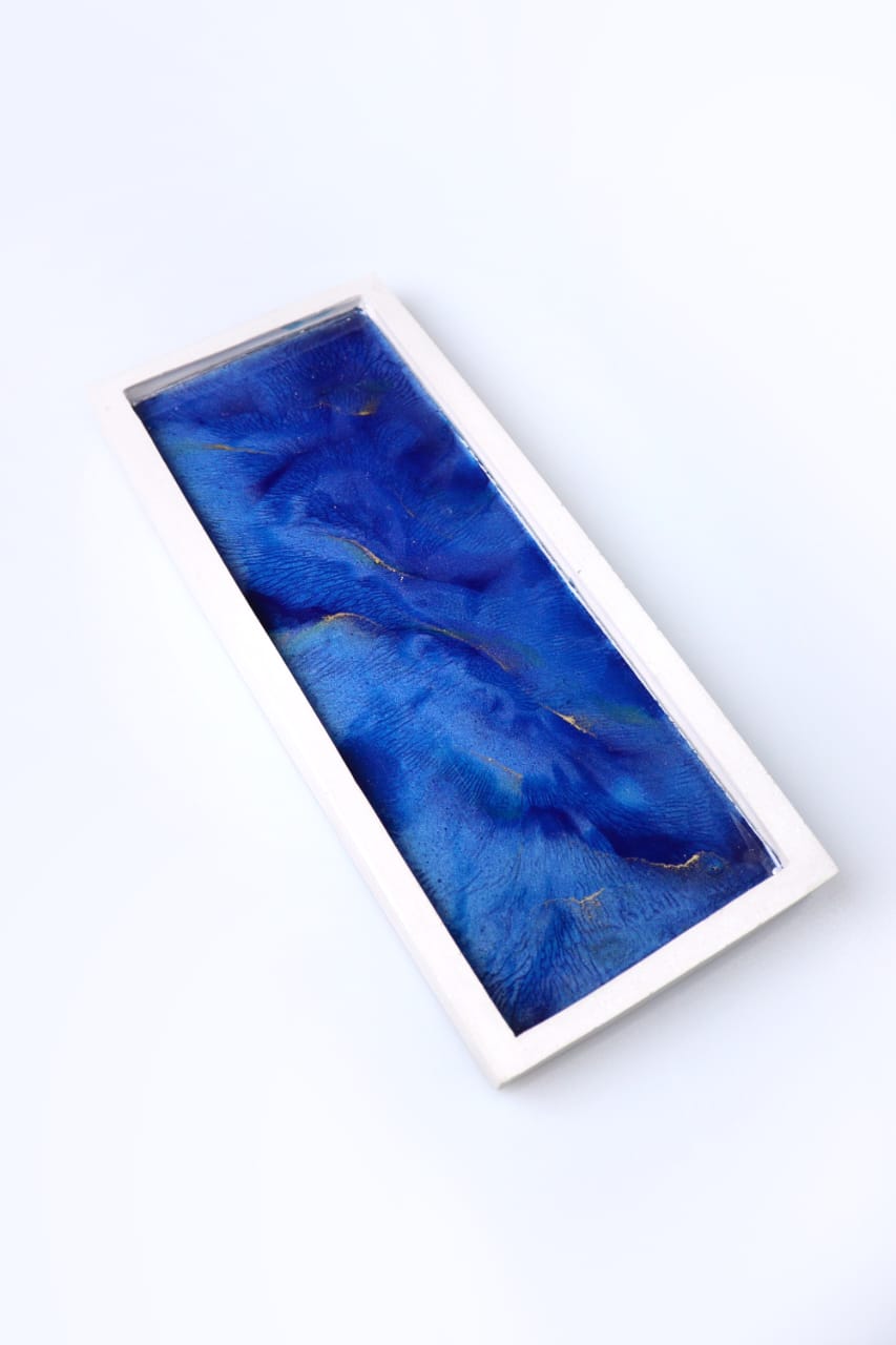 Produzida em resina ecologica e uma camada interna em resina epóxi azul e dourado, ela é perfeita até mesmo para apoiar alimentos pois a parte em resina epóxi permite este uso.
